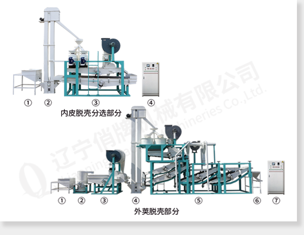 外莢脫殼部分: 螺旋上料斗 ② 原料提升機  多功能除雜機  斗式提升機  脫莢、風選、分選設備  接料斗  電氣控制柜