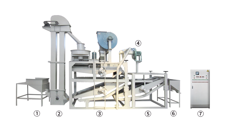 ① 上料斗②斗式提升機 ③ 脫殼、風選、分選主機 ④ 風力回料系統(tǒng) ⑤ 籽米復選機 ⑥ 接料斗 ⑦ 電氣控制柜